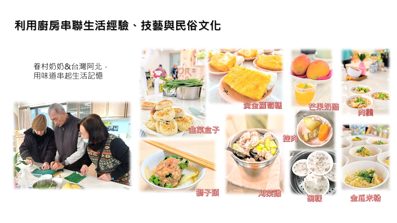 除提供平日白天照顧服務外,中心另安排 認知、懷舊、美食創作、體適能活動、音樂輔療、社區活動、生命回顧團體等,提供中心長者參與,期待延緩退化情況並維持現有肢體功能等狀態。