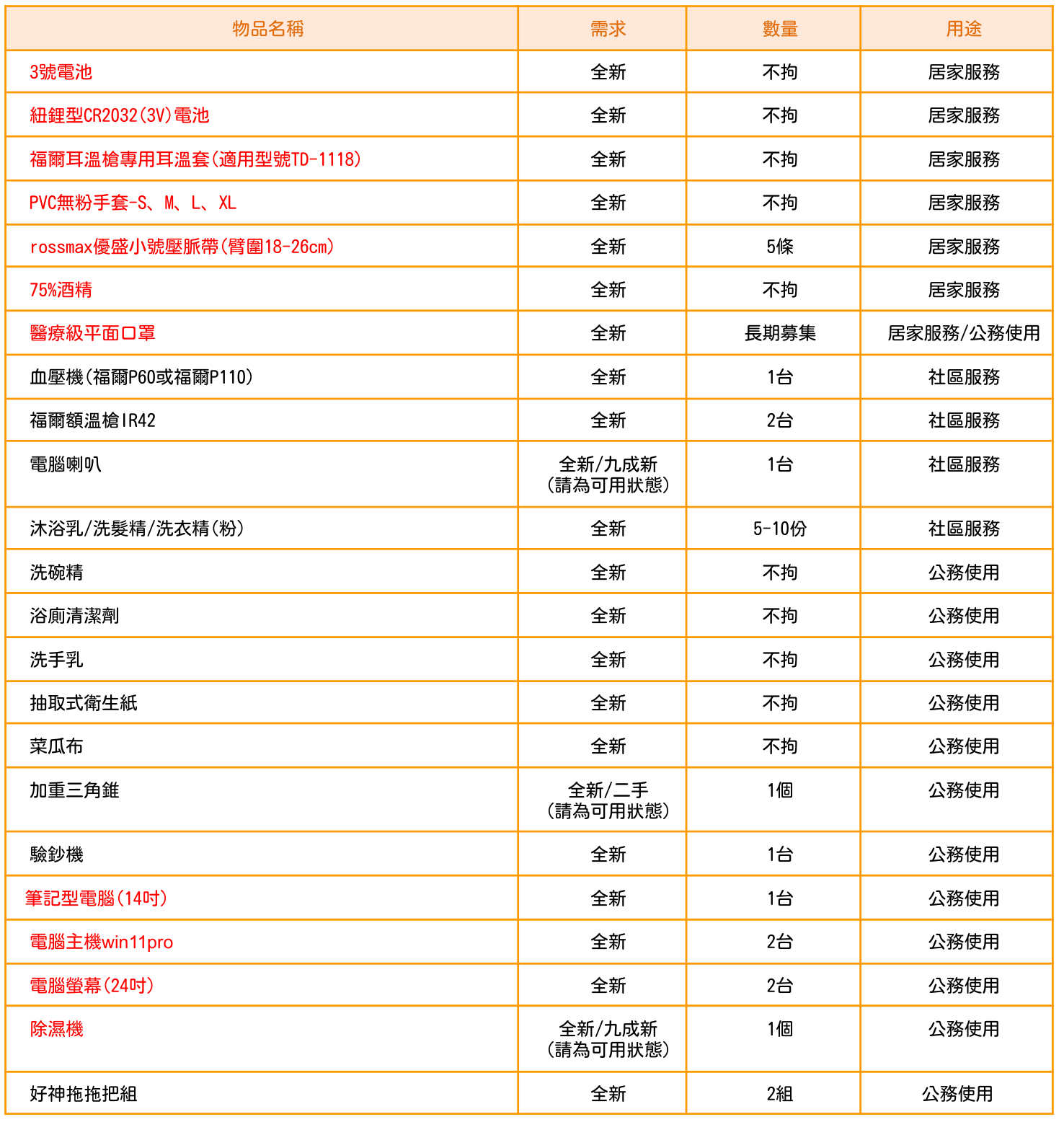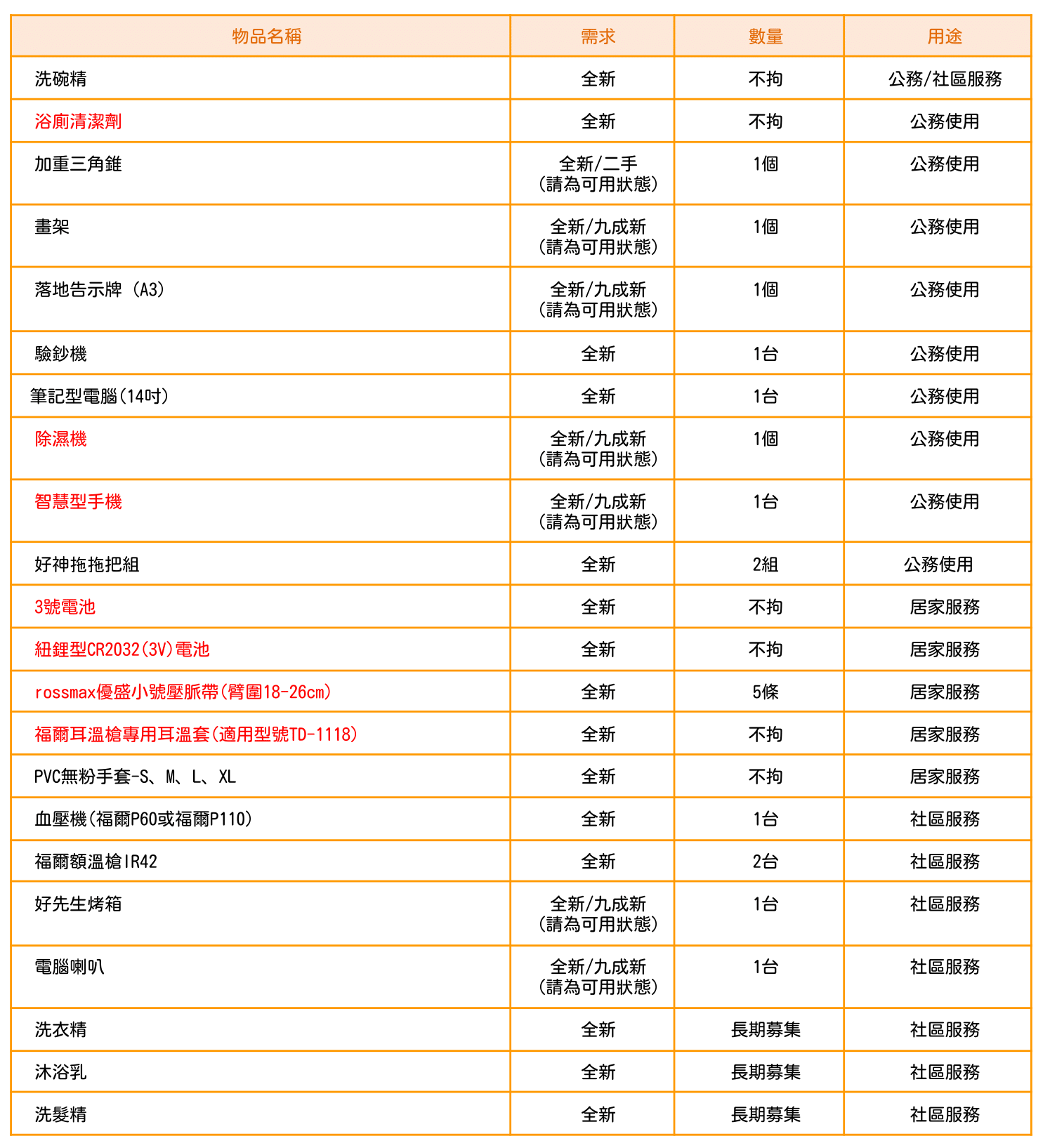 ➜ 非各地區清冊所列的物資:敬請填寫表單https://reurl.cc/jdNxoM,並附上照片圖檔,由專人主動與您聯繫。
