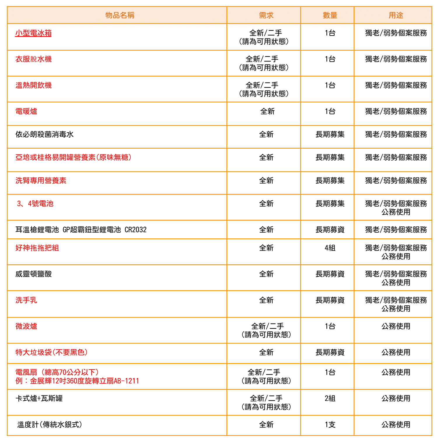 ✓ 婉謝物資:考量個人衛生尺寸與保存效期,故婉謝二手鞋(襪)、衣物以及開封過的食品、尿布。