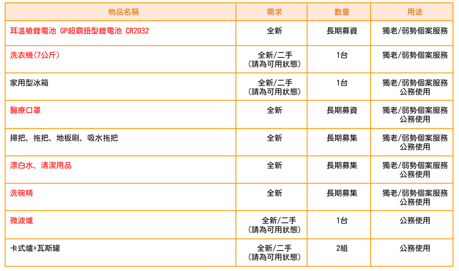 ➜ 非各地區清冊所列的物資:敬請填寫表單https://reurl.cc/jdNxoM,並附上照片圖檔,由專人主動與您聯繫。