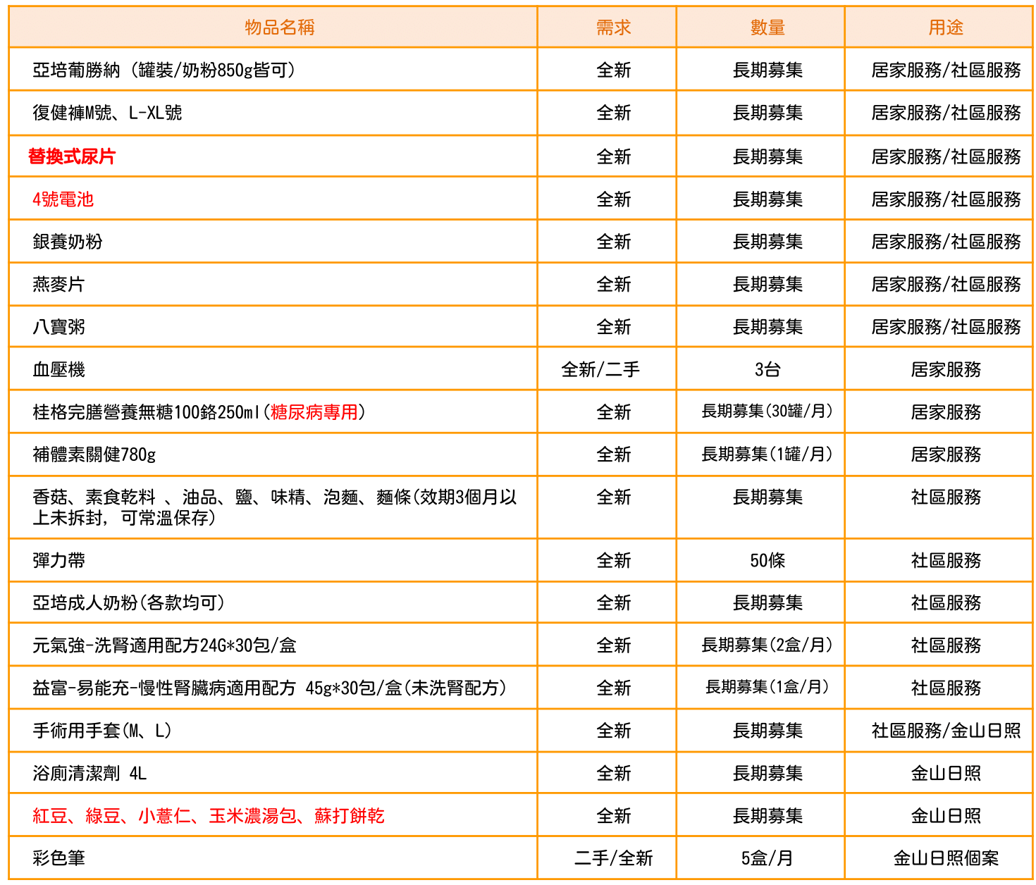 ✓ 婉謝物資:考量個人衛生尺寸與保存效期,故婉謝二手鞋(襪)、衣物以及開封過的食品、尿布。