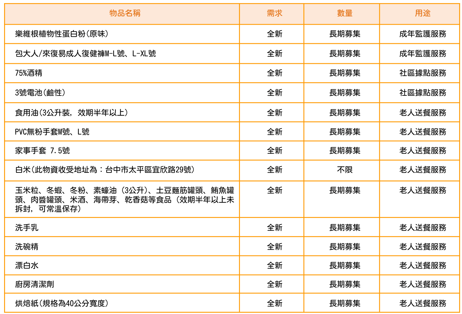 ✓ 關於抵稅:限用於全新物資,並附上購買時的發票(影本或掃描)佐證金額,可由本會開立載金額之捐物收據。