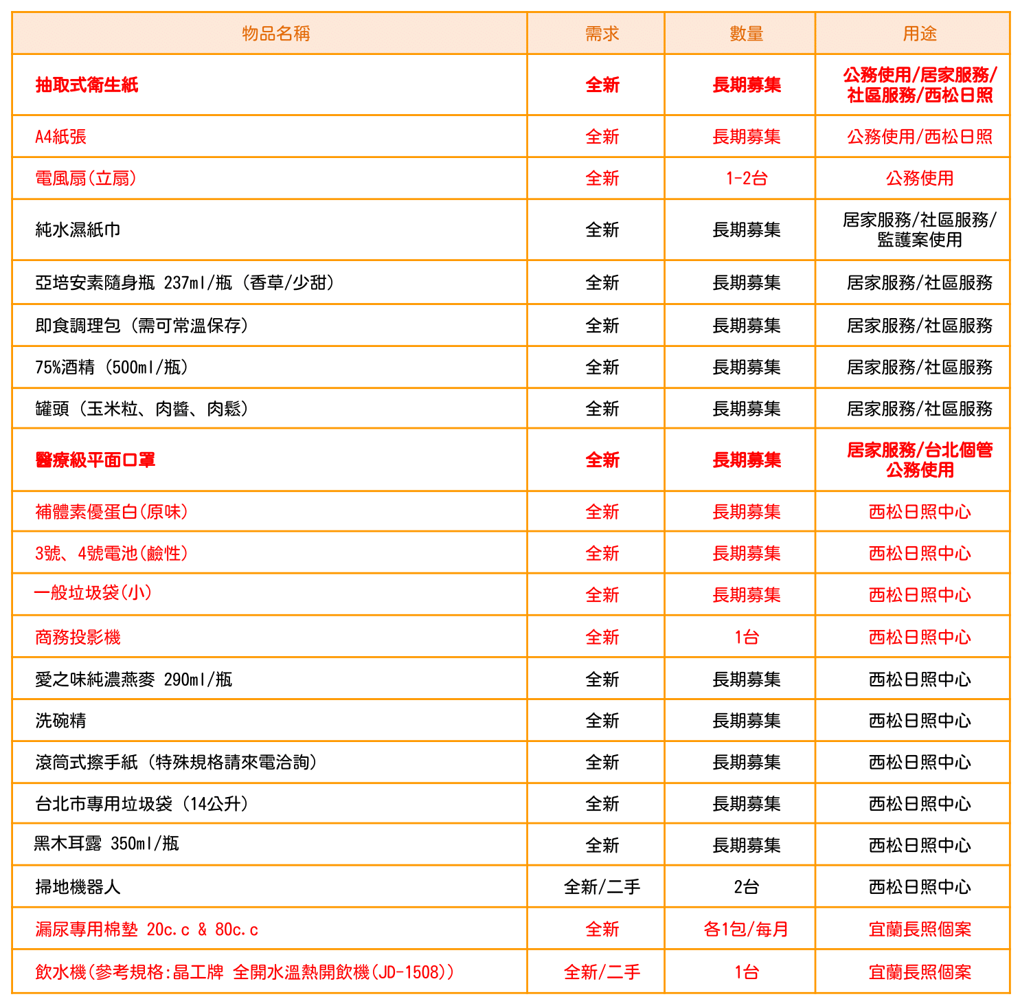 ➜ 非各地區清冊所列的物資:敬請填寫表單https://reurl.cc/jdNxoM,並附上照片圖檔,由專人主動與您聯繫。