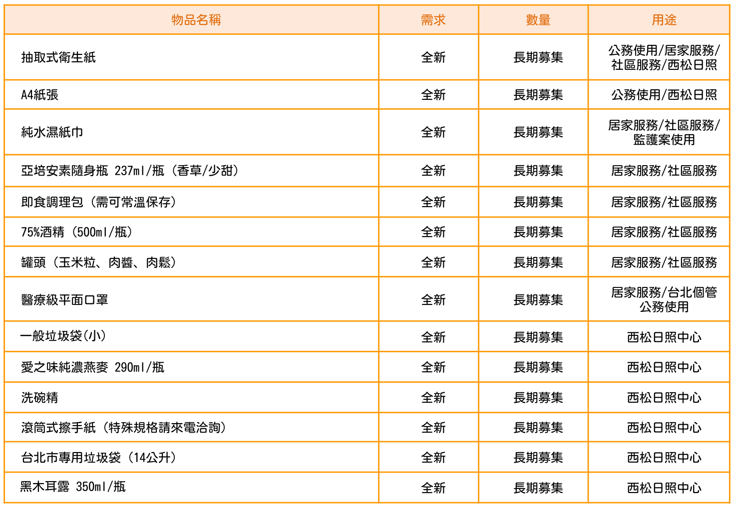 ✓ 婉謝物資:考量個人衛生尺寸與保存效期,故婉謝二手鞋(襪)、衣物以及開封過的食品、尿布。