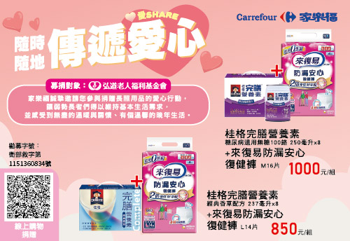 首頁 弘道消息 最新消息 公益串聯愛 【弘道x元初豆坊】角落元夢無加糖豆漿上市 弘道與元初豆坊推出聯名豆漿,支持在地農產,更把愛與關懷,帶進長輩生活的角落。 【雲端料理王|黑白料理挑戰賽】台中地稅局邀您捐發票做公益 台中地稅局邀您捐發票玩遊戲,累積積分、換好禮!支持全台助老服務! 【弘道x大山北月】聯名新品 柑心上市 將守護土地的深情與關懷長輩的初心,融進「柑心」好味裡,邀你品嘗跨界的美好滋味。 【愛來捐款暖公益】7-ELEVEN「把愛找回來」邀您讓愛不間斷 自5月1日起至5月30日止,透過OPENPOINT APP捐贈滿額加贈OPENPOINT點數50點! 【愛Share 隨時隨地傳遞愛心】家樂福邀您一同幫助弱勢長輩生活需求 邀您於【家樂福線上購物網】認購愛心組合,幫助弱勢長輩們維持基本的生活需求! 【端午節傳愛】7-ELEVEN邀您用愛點亮阿公阿嬤的端午佳節! 端午佳節將至,讓我們不只品味美味粽子,更一起傳遞關懷與溫暖!7-ELEVEN 與 弘道老人福利基金會攜手,邀請您一起關懷獨居長輩與弱勢家庭。 【愛的好伴友】為角落孤老人送上熱呼呼的愛 弘道與菇王食品推出公益聯名商品,味覺饗宴結合公益行動,將為孤單角落注入溫暖…… 【王道銀行x弘道助老認同卡】消費即捐款 愛心捐款不費力 王道銀行與弘道基金會合作推出「助老認同卡」, 持「助老認同卡」刷卡消費, 王道銀行將依消費金額0.2% 捐贈予弘道基金會, 讓消費者在消費的同時,也能實際守護高齡長者! 【弘道 X momo愛心百元捐】陪伴弱勢獨老,暖心過好年 弘道攜手momo購物網,邀您響應愛心百元捐,用行動將年味傳遞至弱勢獨老心中! 【寒冬助老 公益聯名禮盒】年節送禮 暖心首選 弘道與菓迷推出「公益聯名禮盒」並展開提撥活動,響應支持獨居弱勢長輩關懷計畫。 【溫暖春水 公益年菜】春水良品邀您一起呷澎派捐愛心 春水良品邀請您一同加入2025年公益年菜捐款的行列,協助為弱勢長輩們提供服務,讓你我的愛心化為冬日溫暖春水注入需要的角落。 【樂齡有愛,活立同行】Famica 與您一起關懷弱勢長輩 即日起至指定連結下單,Famica將提撥每筆消費金額9%,支持弘道為弱勢長輩提供全年服務。 1 2 3 4 5